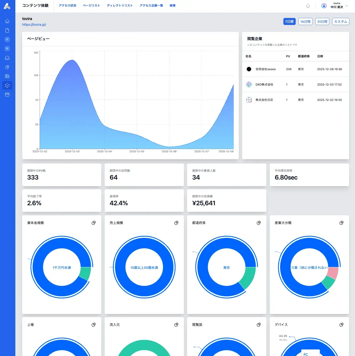 どのカテゴリが最も閲覧されているか、どの業種が関心を持っているかを把握できます。
